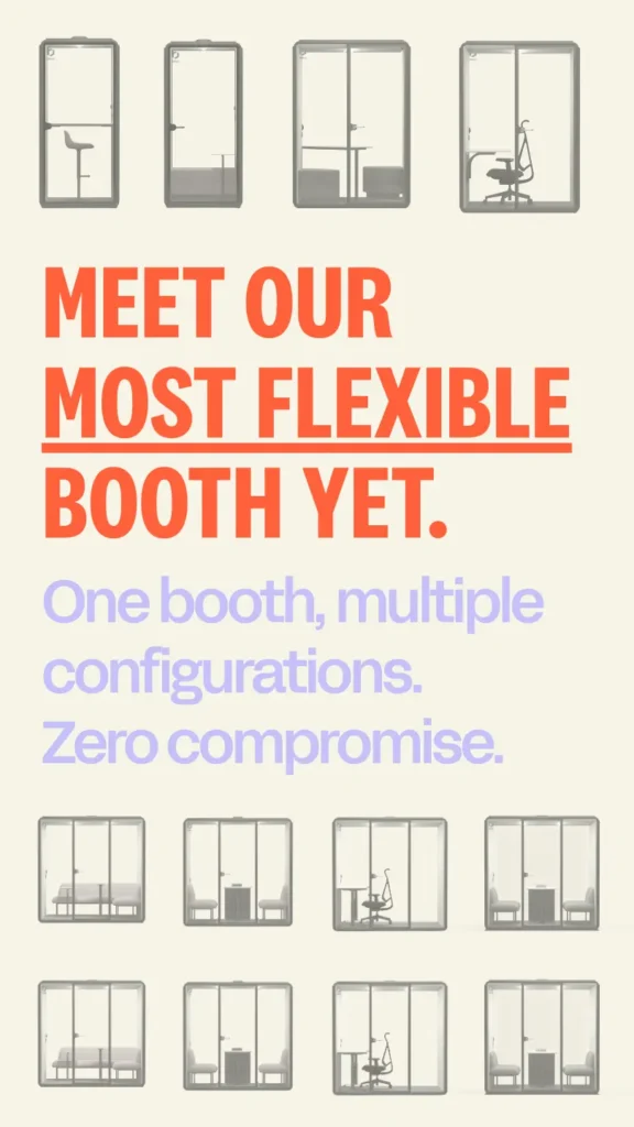 Every booth now supports multiple, pre-designed interior configurations. Think standing desks, soft seating, collaborative nooks. You can reconfigure without replacing. No structural changes. No costly retrofits. Just one smart shell, with endless new identities.