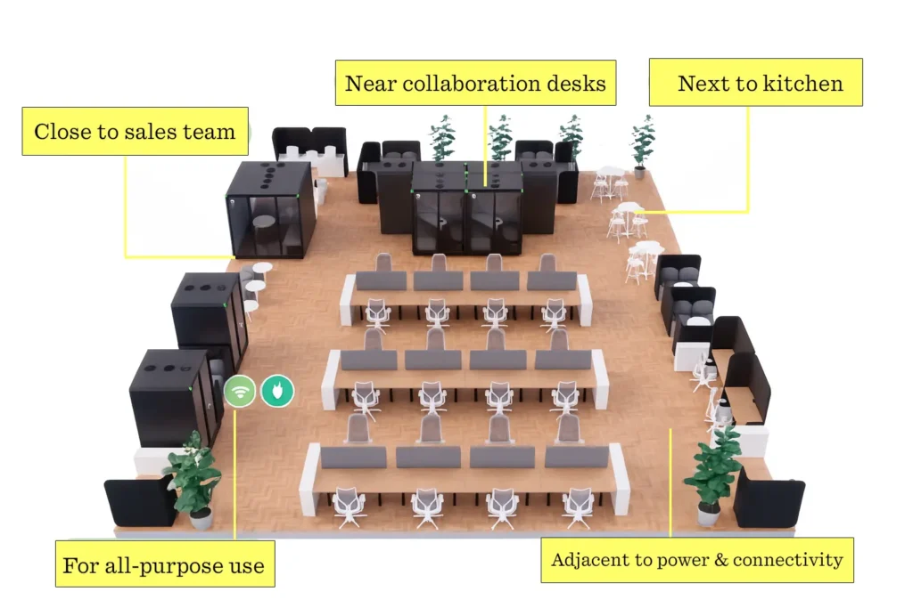 There’s a common instinct to place a booth somewhere quiet. That makes sense at first glance. But booths are designed to create quiet where it doesn’t already exist. They’re most effective when placed near busier areas, like collaboration zones, sales pods, kitchens, or shared work areas.